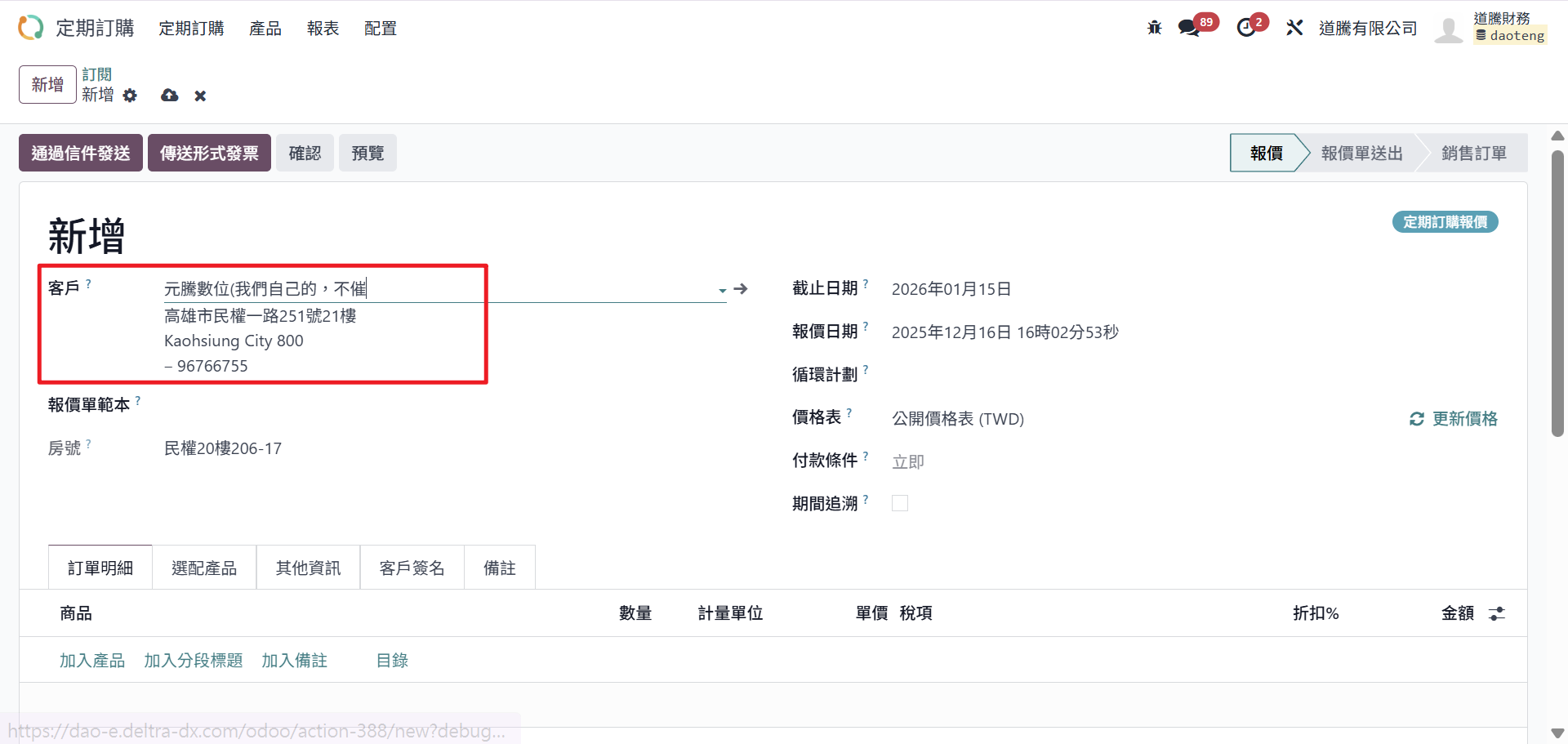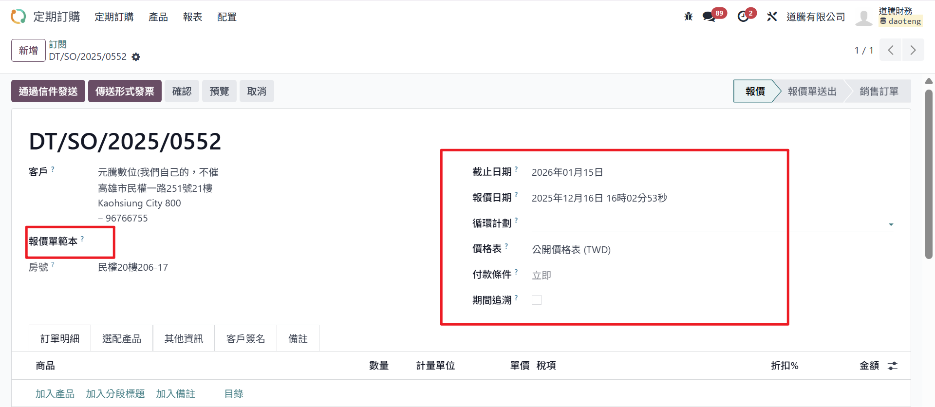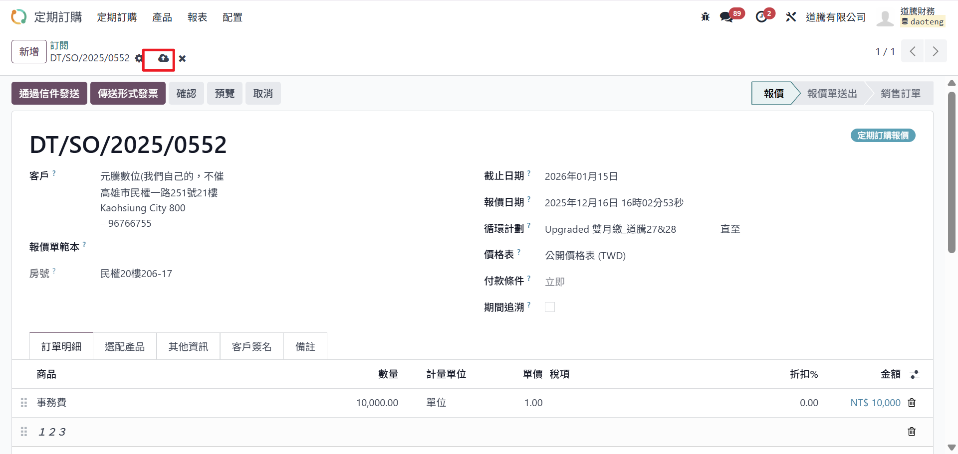 Step6:確認金額無誤後,點選儲存。目前單據的狀態為「報價」,若需繼續流程,則點選「確認」轉進行中的訂單。