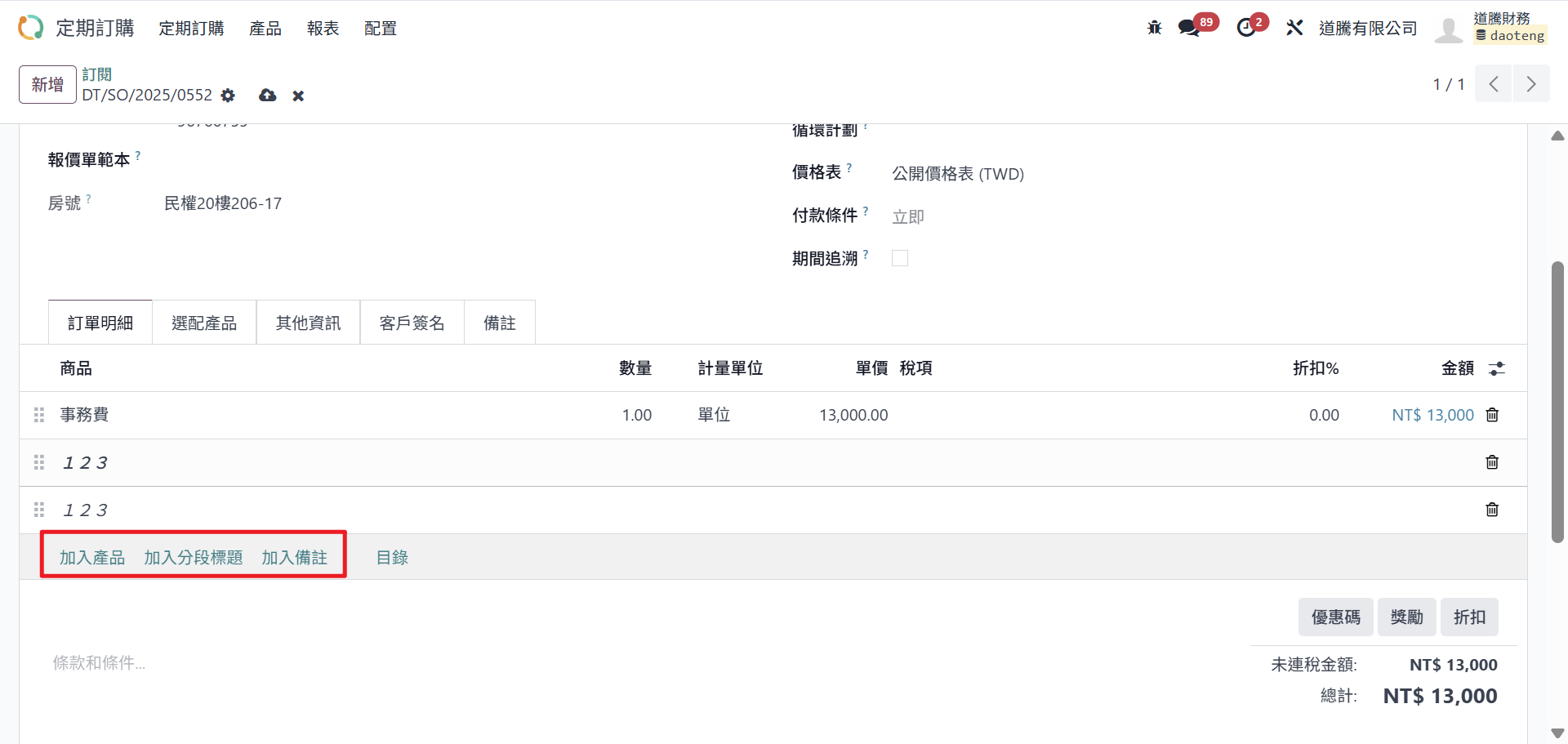 Step5:在定期訂購畫面中新增產品列,點選「加入產品」。再依序填寫產品(Product)、數量(Quantity)、單位(Unit)、單價(Unit Price)、稅別(Taxes)(依公司設定)。