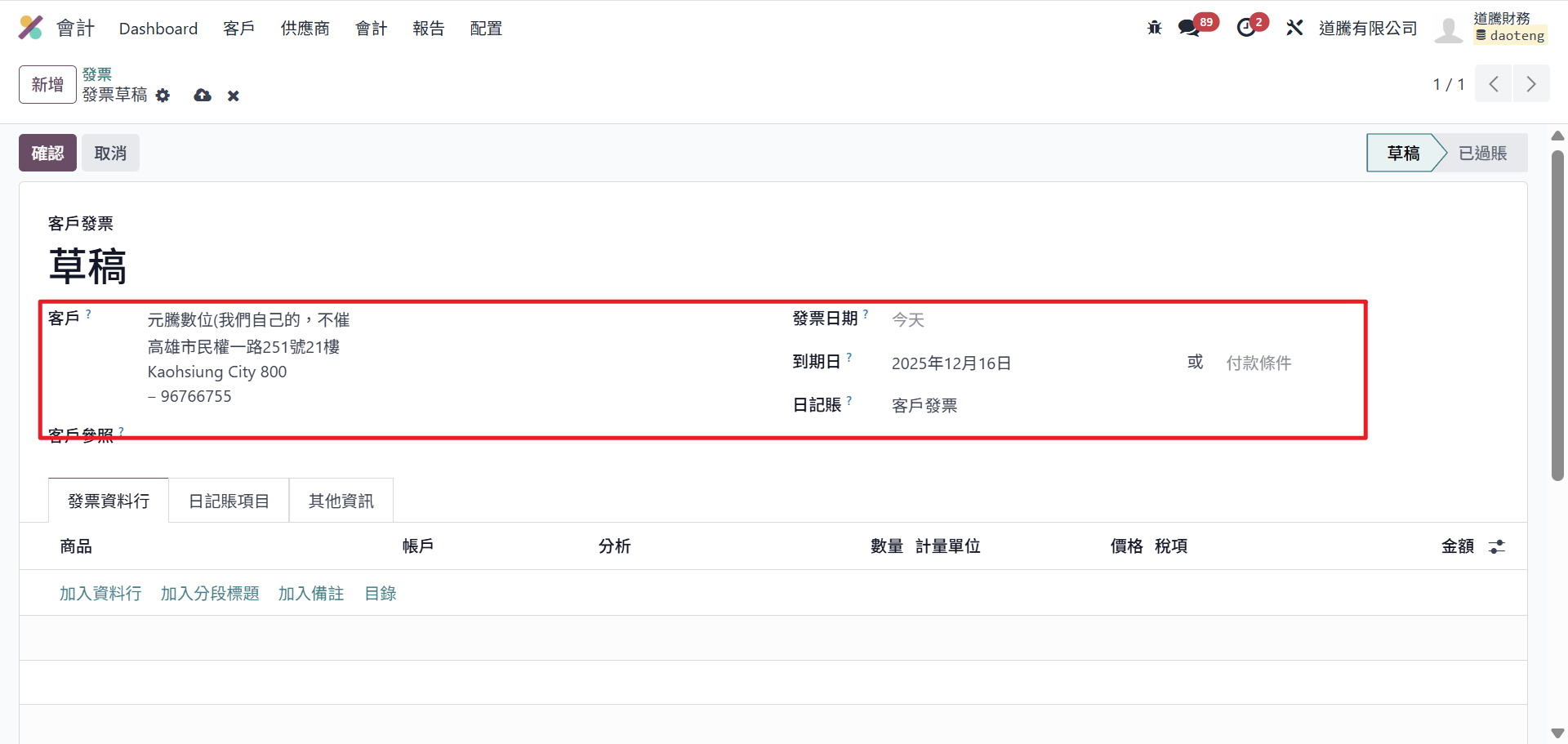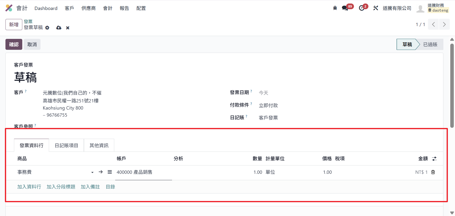 Step 5:在「發票資料行」頁籤新增品項,產品、描述、數量、單價、稅項(Tax)、帳戶(通常會依產品/預設自動帶入)。