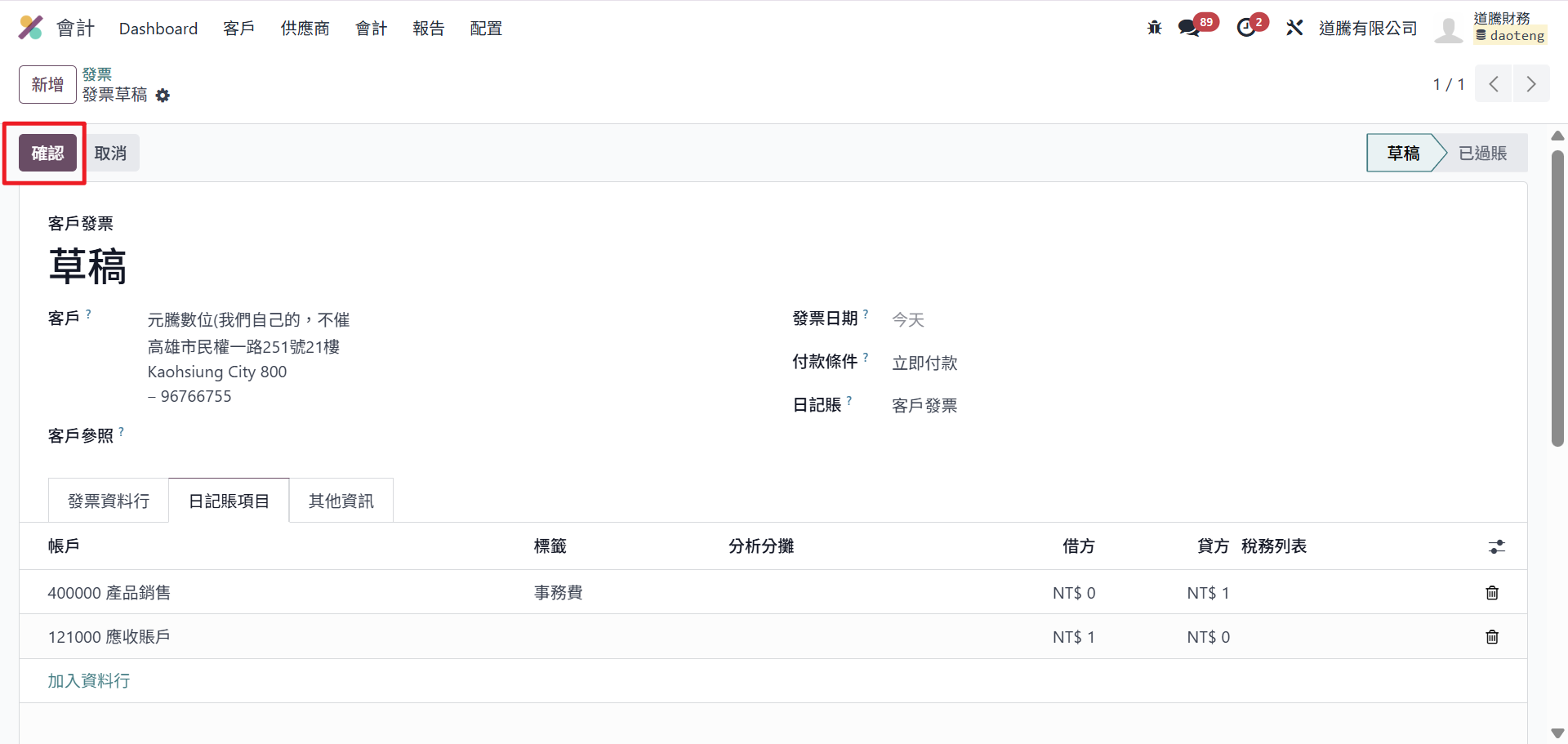 Step7:若以上資訊皆確認無誤後,即可點選確認進行過帳。