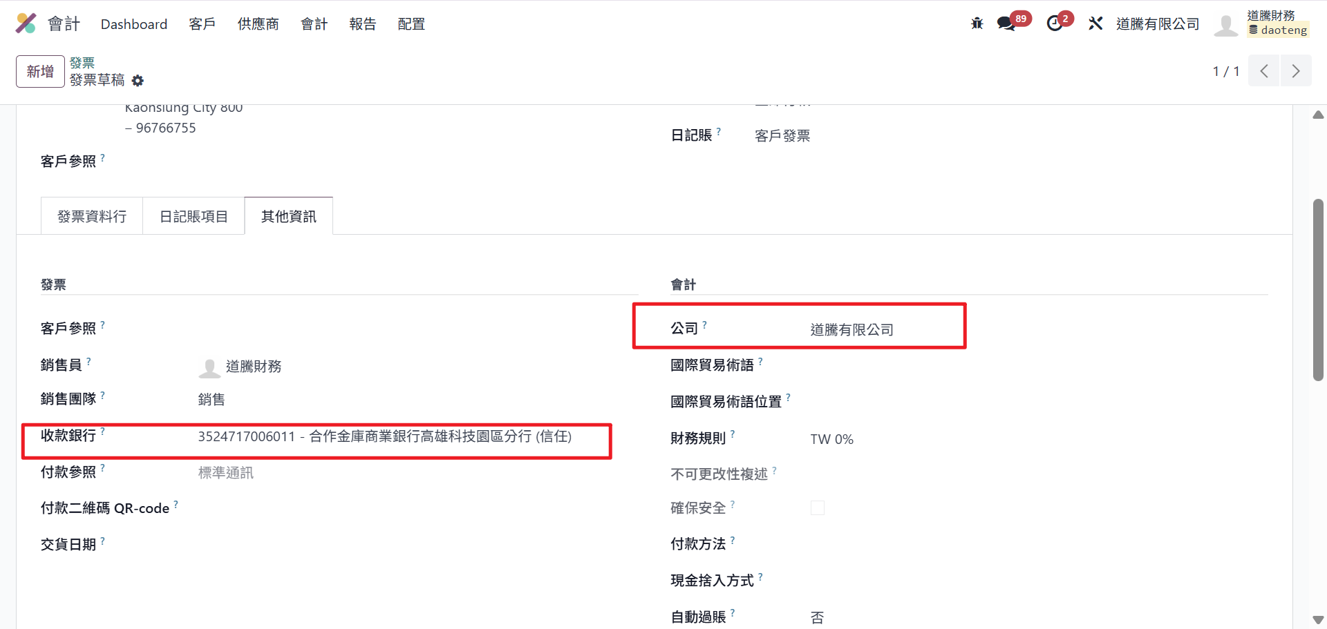 Step6:確認小計、稅額、總額正確。除了發票資料行之外,也需確認【其他資訊】的頁籤。需確認收款銀行是否正確。