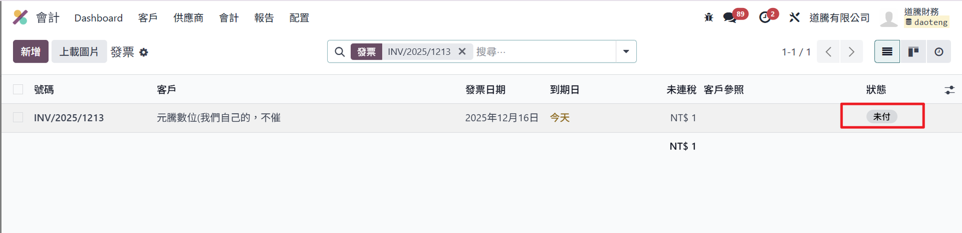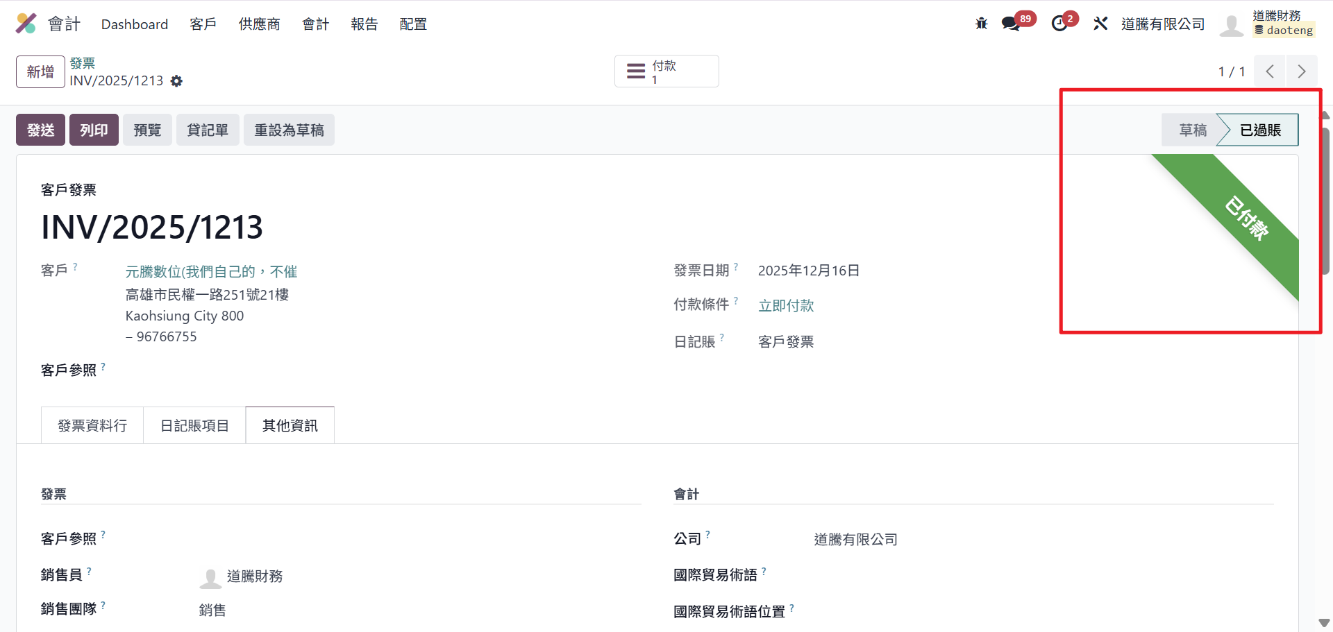 付款完成:發票狀態會變為「已付款」