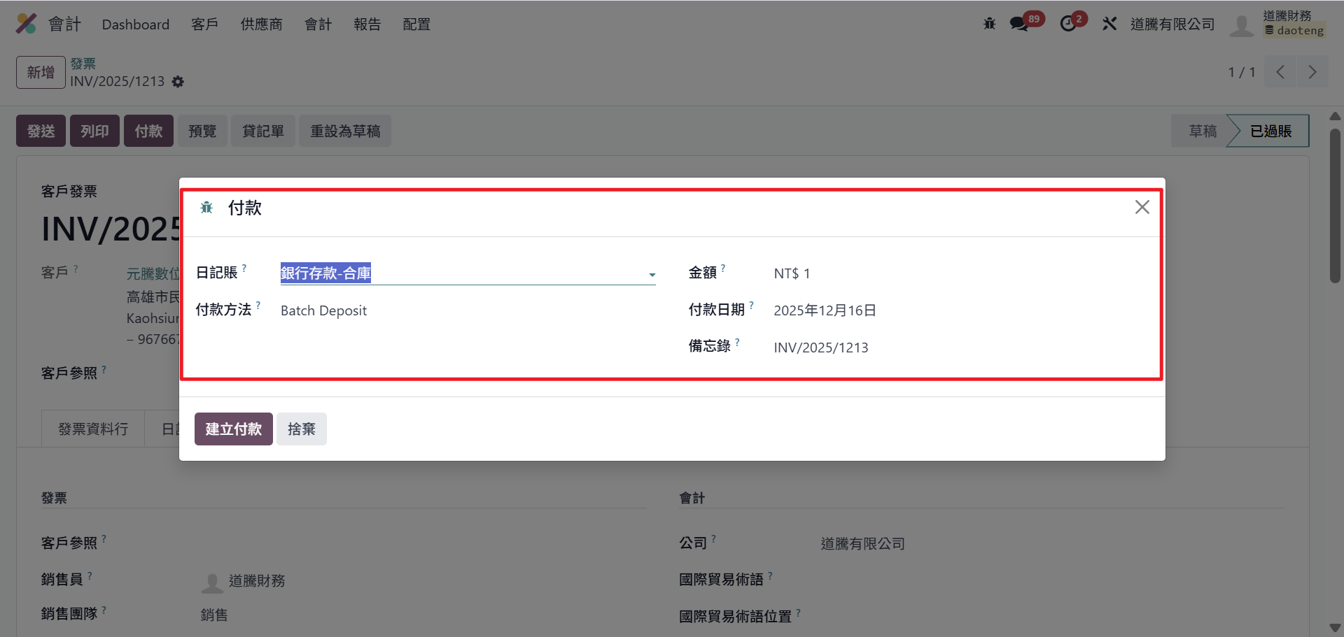 步驟四:點選【建立付款】,此單據狀態會更改為「已付款」。