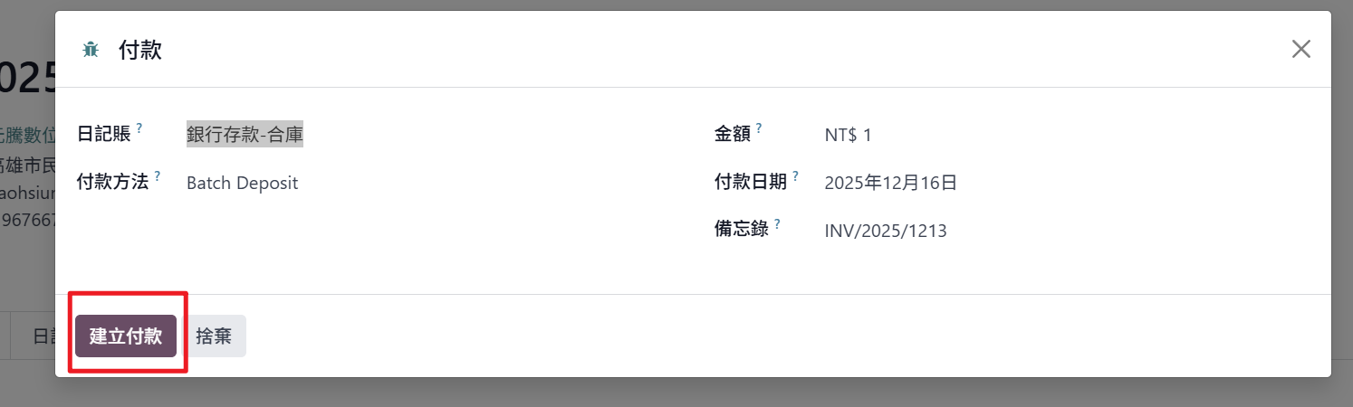 - 付款方法:付款方式的分類標籤,不影響金額,但會影響對帳與報表分類。可不更動。